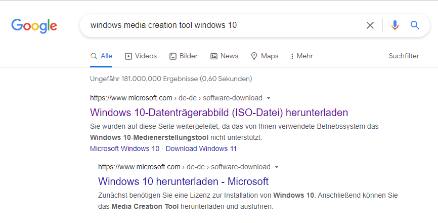 - Geben Sie "Windows Media Creation Tool Windows 10" ein.
