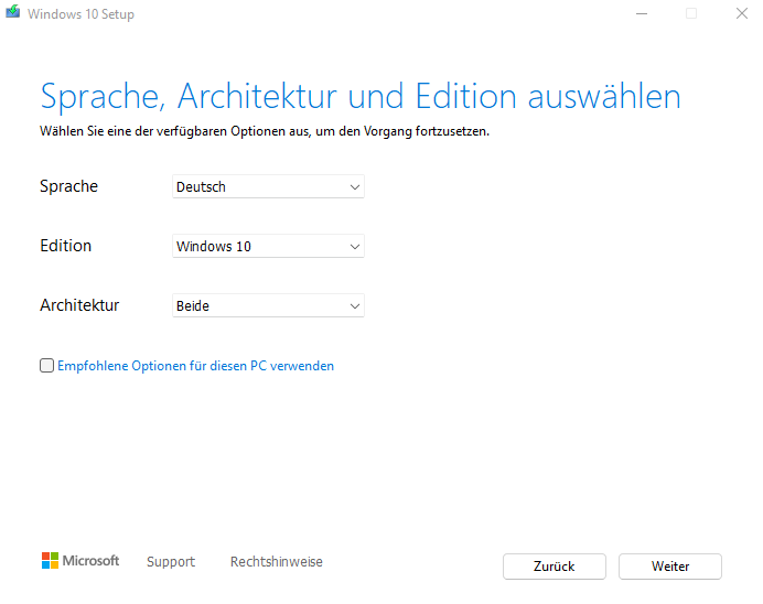 - Währen Sie zu installierte Sprache und Version aus. Wir empfehlen bei der Architektur auf: "Beide" umstellen.