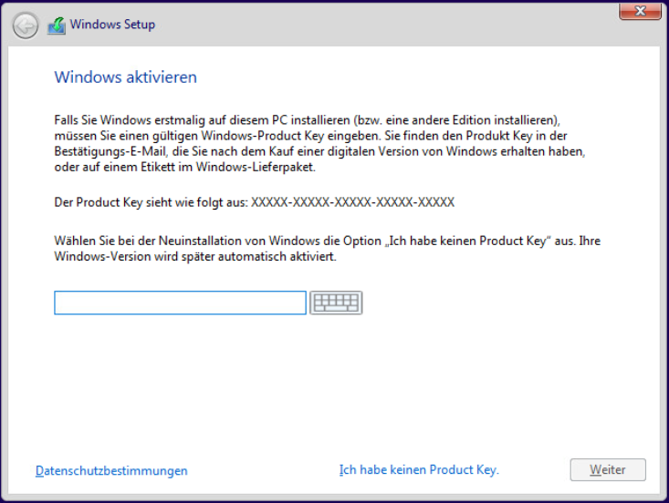 - Klicken Sie auf "Ich habe keinen Produkt Key" - Erklärung warum diese Option gewählt wurde, finden Sie bei uns in Wissensdatenbank: neXchance IT GmbH Knowledge Base - Wo finde ich meine Windowslizenz