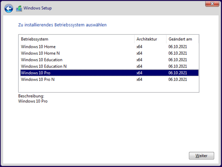 - Wählen Sie das gewünschte Betriebssystem aus, es kann vorkommen dass dieser Schritt übersprungen wird und gleich das Windows 10 Pro ausgewählt wird.