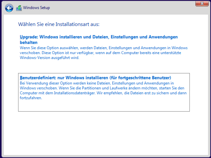 - Wählen Sie das Benutzerdefinierte Installation aus.